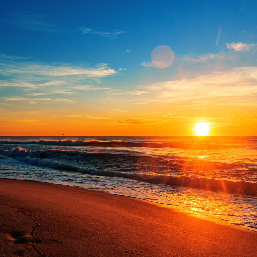 Reme ao entardecer e contemple o espetáculo das cores do pôr do sol sobre as águas calmas.